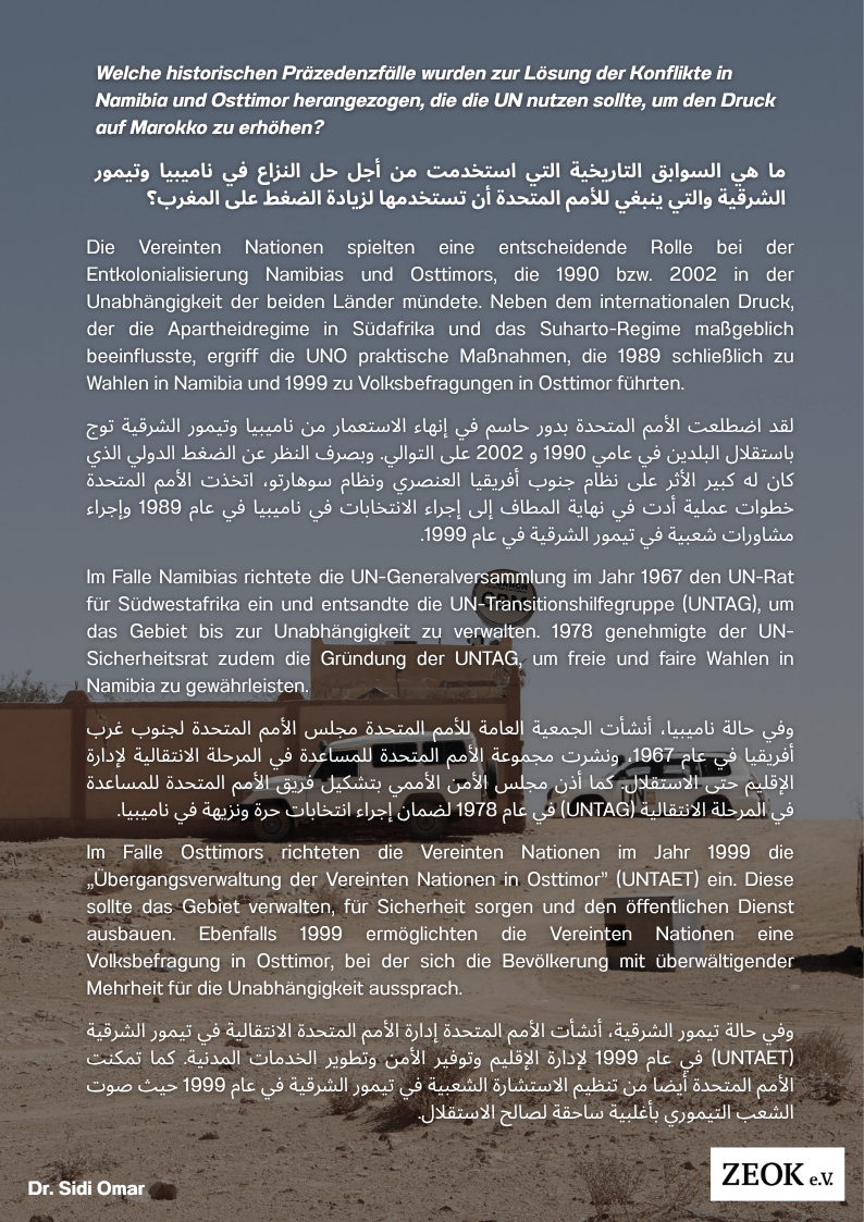 Welche historischen Präzedenzfälle wurden zur Lösung der Konflikte in Namibia und Osttimor herangezogen, die die UN nutzen sollte, um den Druck auf Marokko zu erhöhen?
