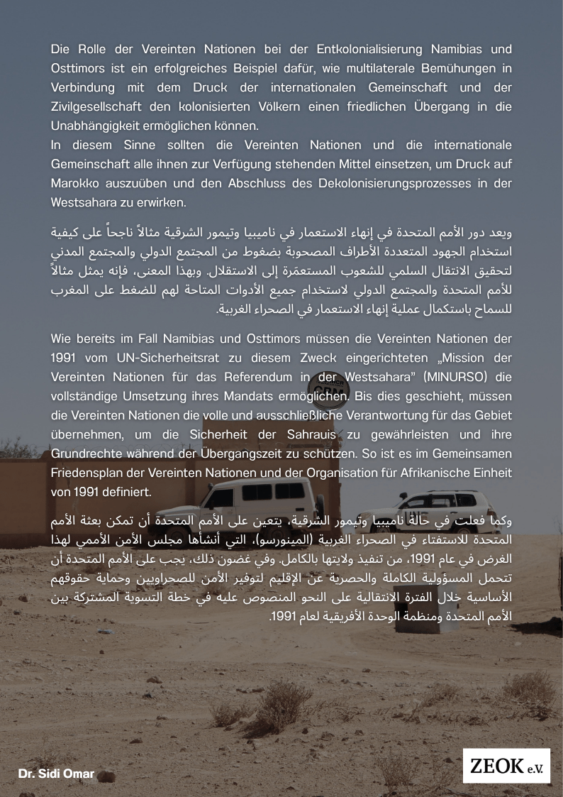 Vereinten Nationen für das Referendum in der Westsahara” (MINURSO) die vollständige Umsetzung ihres Mandats ermöglichen. Bis dies geschieht, müssen die Vereinten Nationen die volle und ausschließliche Verantwortung für das Gebiet