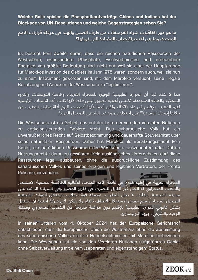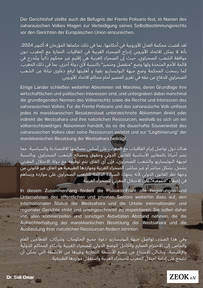 wirtschaftlichen und politischen Interessen sind, und untergraben dabei manchmal die grundlegenden Normen des Völkerrechts sowie die Rechte und Interessen des saharauischen Volkes. Für die Frente Polisario und das saharauische Volk umfasst jedes mi marokkanischen Besatzerstaat unterzeichnete Abkommen direkt oder indirekt die Westsahara und ihre natürlichen Ressourcen, weshalb es sich um ein völkerrechtswidriges Abkommen handelt, da es die dauerhafte Souveränität des saharauischen Volkes über seine Ressourcen verletzt und zur “Legitimierung” der marokkanischen Besatzung der Westsahara beiträgt.