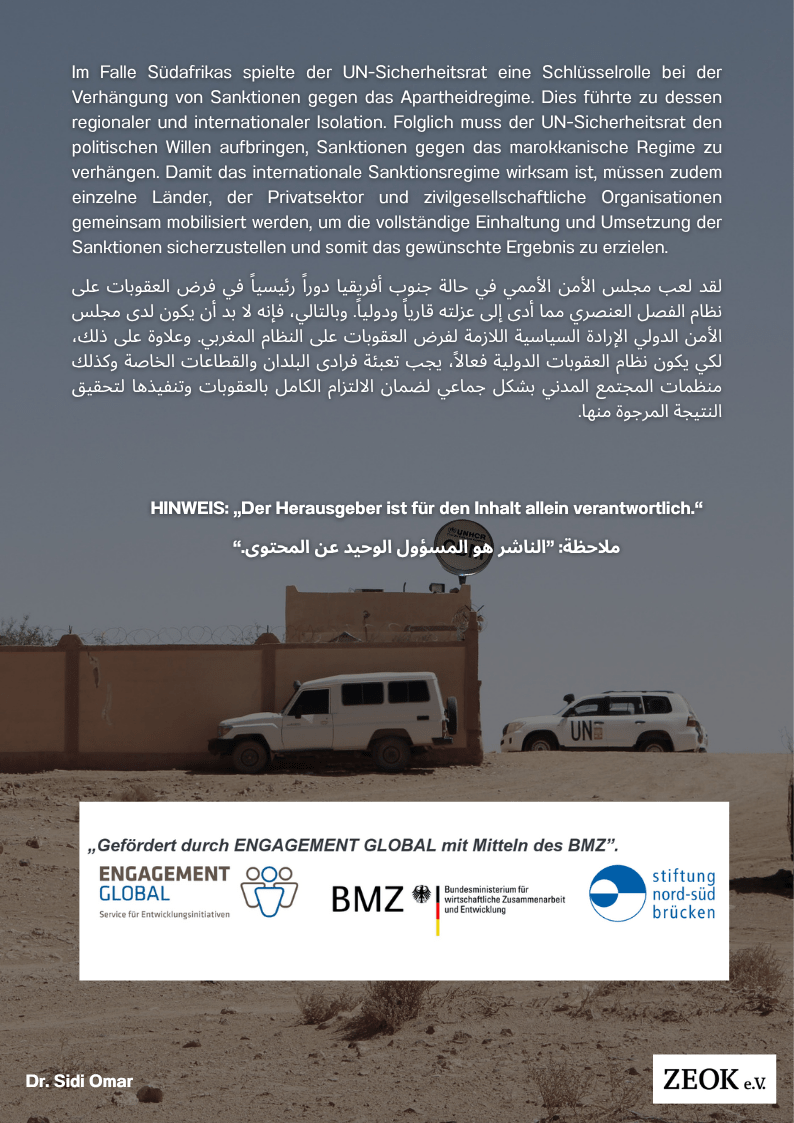Im Falle Südafrikas spielte der UN-Sicherheitsrat eine Schlüsselrolle bei der Verhängung von Sanktionen gegen das Apartheidregime. Dies führte zu dessen regionaler und internationaler Isolation. Folglich muss der UN-Sicherheitsrat den politischen Willen aufbringen, Sanktionen gegen das marokkanische Regime zu verhängen. Damit das internationale Sanktionsregime wirksam ist, müssen zudem
