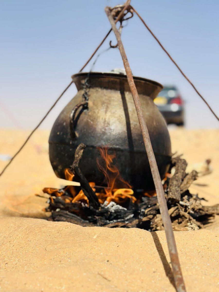 Die Teezeremonie, die das Zentrum der saharauischen Kultur bildet, ist ein tägliches Ritual, das Geduld, Dankbarkeit und Zusammenhalt verkörpert. Tee zu kochen ist eine Kunst und ein Zeichen der Achtung: Er wird in drei Aufgüssen zubereitet, von denen jeder eine eigene Bedeutung und einen eigenen Geschmack hat.