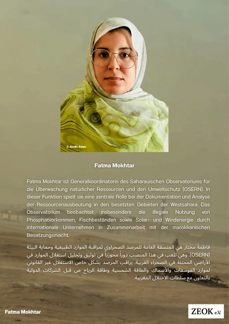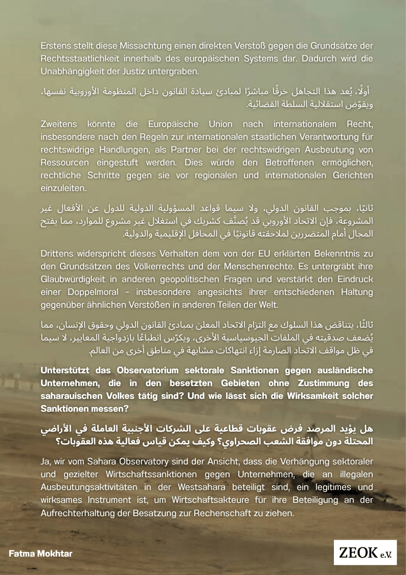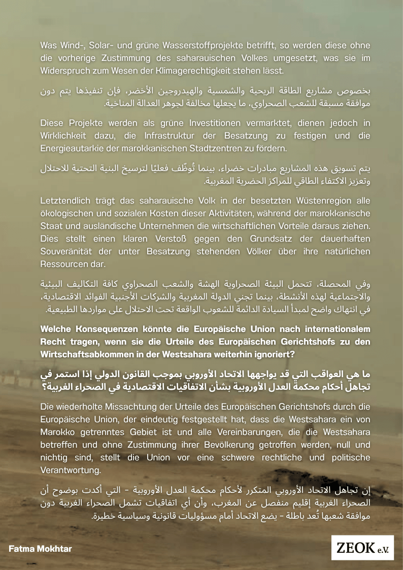 Letztendlich trägt das saharauische Volk in der besetzten Wüstenregion alle ökologischen und sozialen Kosten dieser Aktivitäten, während der marokkanische Staat und ausländische Unternehmen die wirtschaftlichen Vorteile daraus ziehen. Dies stellt einen klaren Verstoß gegen den Grundsatz der dauerhaften Souveränität der unter Besatzung stehenden Völker über ihre natürlichen Ressourcen dar.