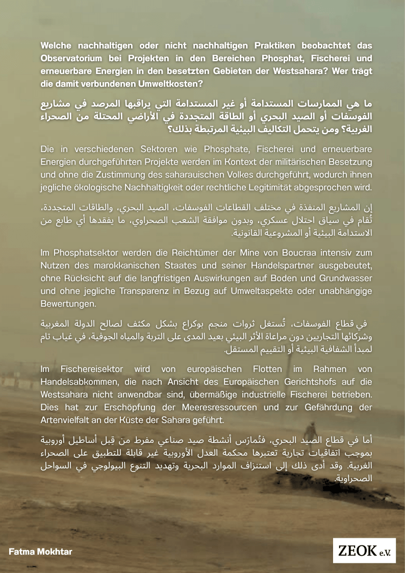 Die in verschiedenen Sektoren wie Phosphate, Fischerei und erneuerbare Energien durchgeführten Projekte werden im Kontext der militärischen Besetzung und ohne die Zustimmung des saharauischen Volkes durchgeführt, wodurch ihnen jegliche ökologische Nachhaltigkeit oder rechtliche Legitimität abgesprochen wird.