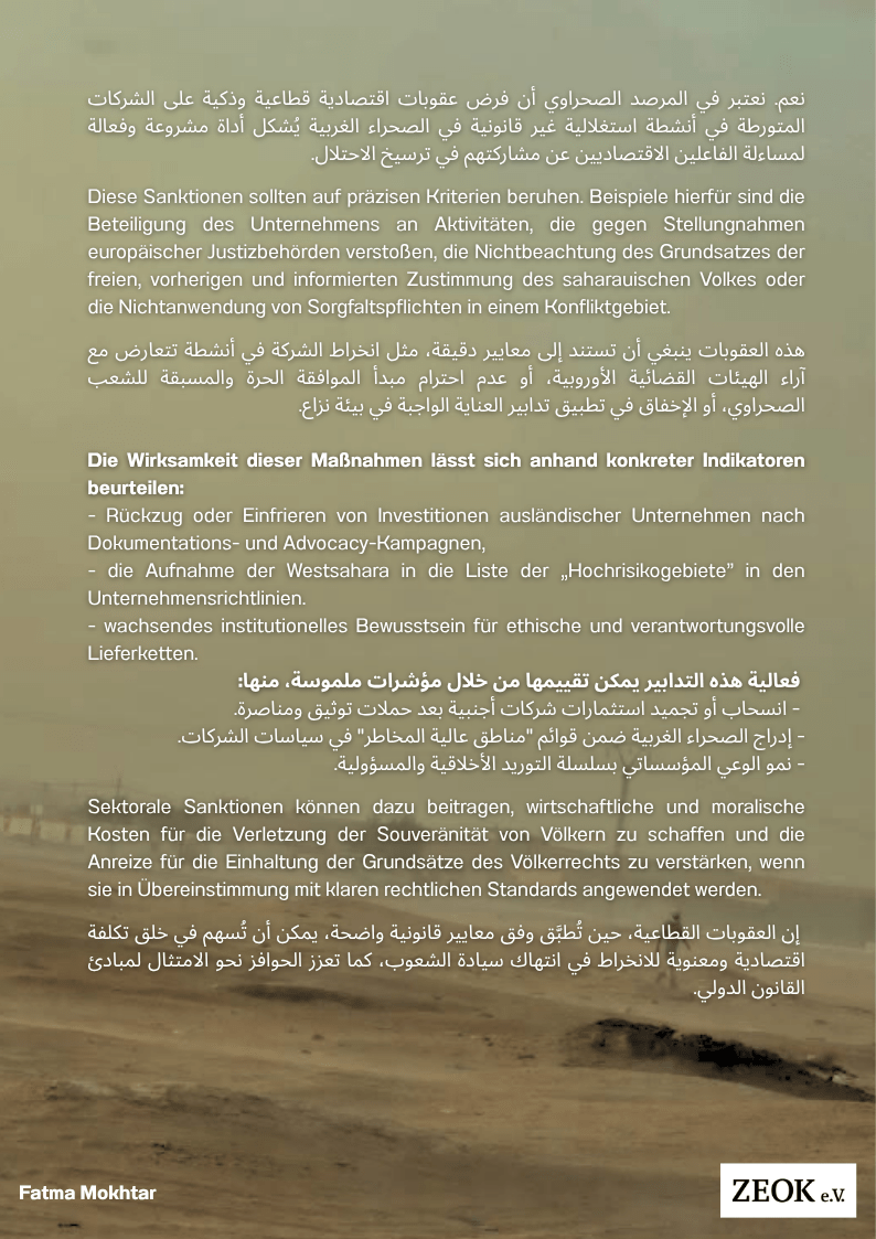 3.Unterstützt das Observatorium sektorale Sanktionen gegen ausländische Unternehmen, die in den besetzten Gebieten ohne Zustimmung des saharauischen Volkes tätig sind? Und wie lässt sich die Wirksamkeit solcher Sanktionen messen?