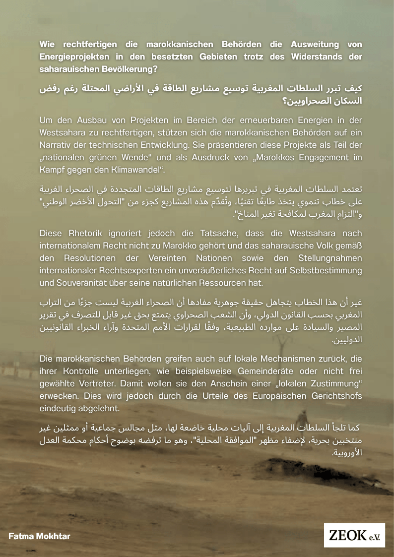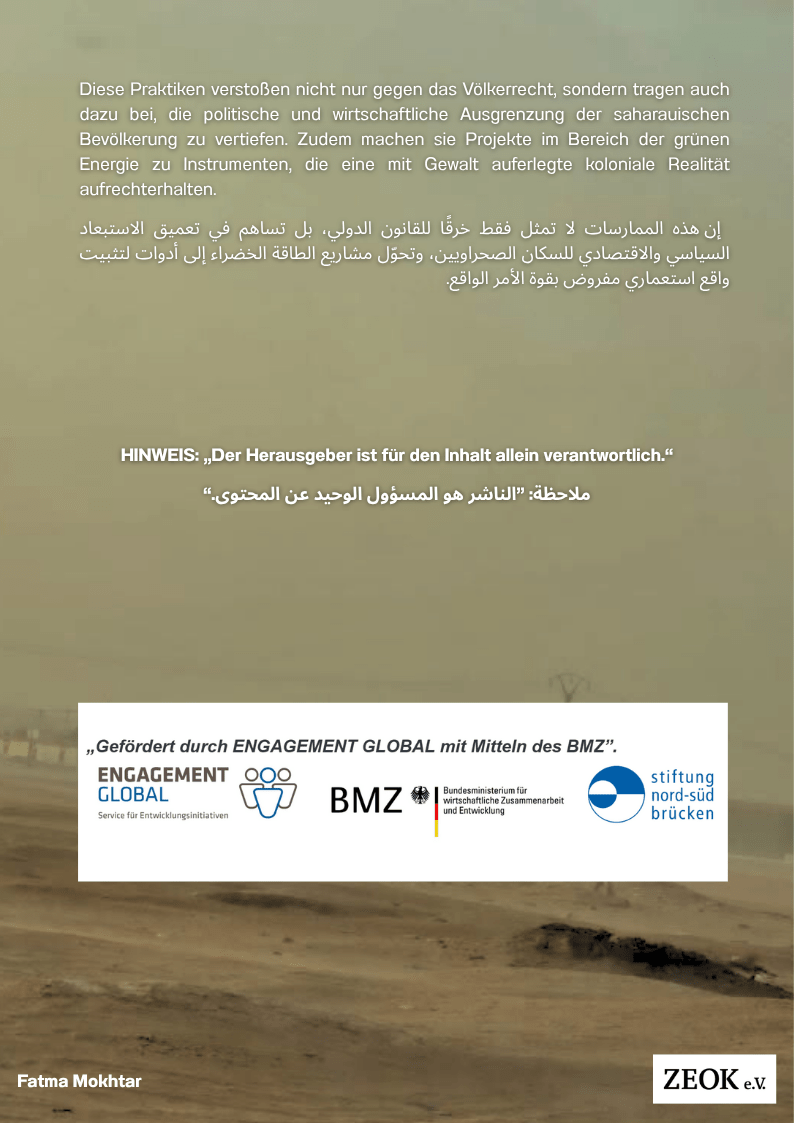 Diese Praktiken verstoßen nicht nur gegen das Völkerrecht, sondern tragen auch dazu bei, die politische und wirtschaftliche Ausgrenzung der saharauischen Bevölkerung zu vertiefen. Zudem machen sie Projekte im Bereich der grünen Energie zu Instrumenten, die eine mit Gewalt auferlegte koloniale Realität aufrechterhalten.