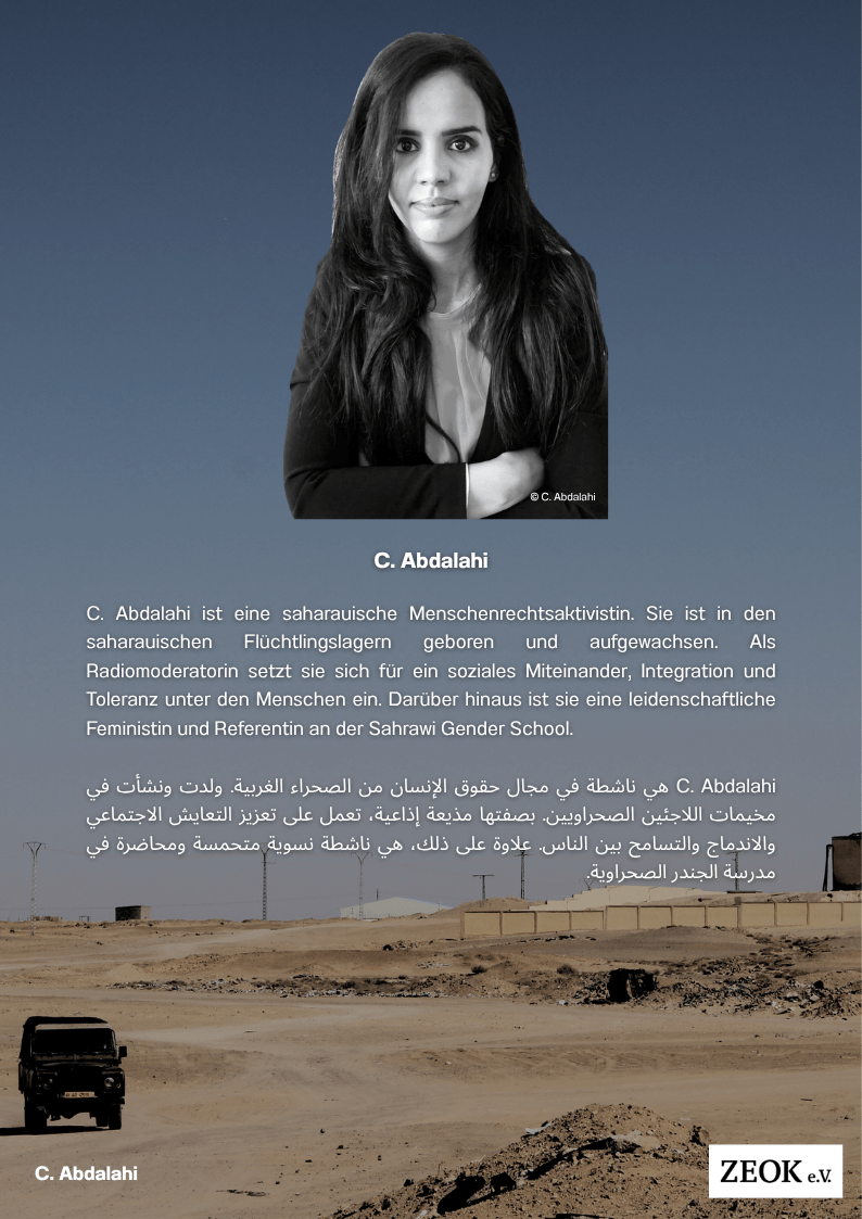 C. Abdalahi ist eine saharauische Menschenrechtsaktivistin. Sie ist in den saharauischen Flüchtlingslagern geboren und aufgewachsen. Als Radiomoderatorin setzt sie sich für ein soziales Miteinander, Integration und Toleranz unter den Menschen ein. Darüber hinaus ist sie eine leidenschaftliche Feministin und Referentin an der Sahrawi Gender School.